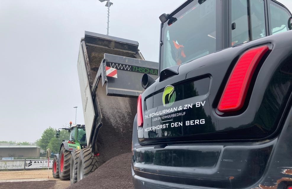 Op locatie word de onderlaag omgeladen in kleine kippers om deze vervolgens over het veld te verdelen.